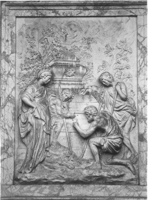 بر روی مقبرهی شپرد «Shepherd»، به معنی شبان، در عمارت شاگبرو، یک کندهکاری وجود دارد که زنی را در حال نگاه کردن به سه شبان نشان میدهد. این سه شبان به یک گور اشاره میکنند. بر روی گور، این نوشته تاریخی به زبان لاتین نوشته شده است: «Et in arcadia ego» (یعنی "من هم در آرکادیا هستم”). این کندهکاری، اقتباسی است از یک نقاشی اثر هنرمند فرانسوی، نیکولاس پوسن، که نام آن هم Et in arcadia ego میباشد. اما کندهکاری، چند تفاوت عمده با نقاشی دارد، که مهمترین این تفاوتها، قرینه شدن افقی تصویر است. تفاوت دیگر، تغییر در حرفی است که یکی از شبانان به آن اشاره میکند. در نقاشی، شبان به حرف R در ARCADIA اشاره میکند. انگشت روی مجسمه شکسته است، اما معلوم است که جهت آن به سمت N در IN بوده است. همچنین، در مجسمه، سنگ قبر دیگری بر روی قبری که عبارات لاتین روی آن حکاکی شده، قرار دارد.