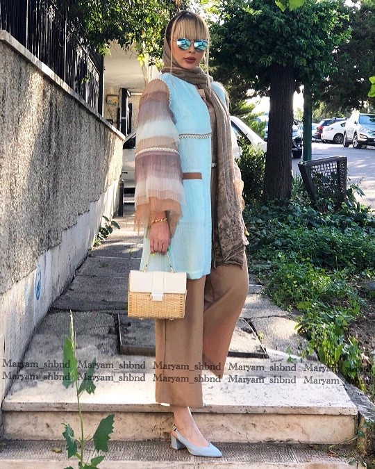 استفاده از رنگ قهوه ای به عنوان رنگ اصلی و ترکیبش با رنگ آبی روشن، ترکیبی که در طبیعت بارها دیده شده است. شال و کفش کرم و کیف همرنگ با مانتو و شومیز استایل کاملی را تشکیل داده است.
