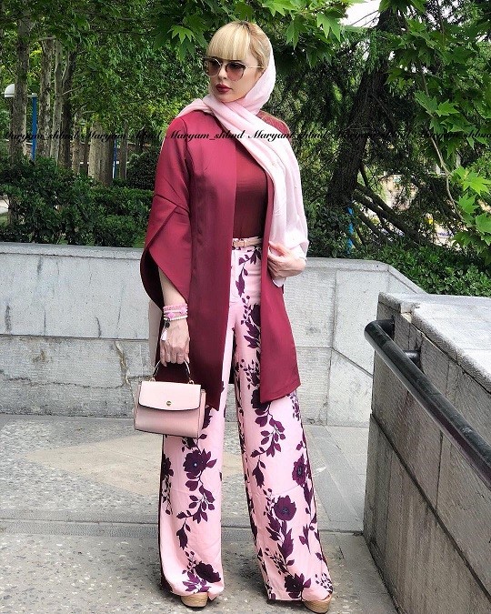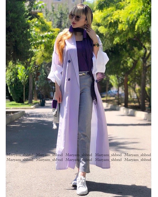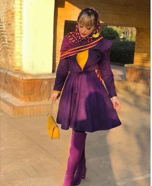 از زیباترین مکمل های رنگ بنفش، رنگ زرد می باشد. استفاده از کیف زرد و روسری طرح دار زیبایی این استایل را بیشتر جلوه می دهد.
