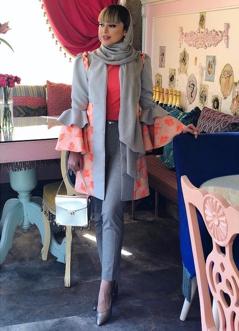 رنگ مرجانی با رنگ طوسی ترکیب بسیار شیک دارد. در این استایل فقط از دو رنگ مرجانی و طوسی استفاده شده است.چون آستین های مانتو برش دار و طرحدار است شال ساده همرنگ استایل را کامل می کند.